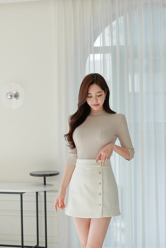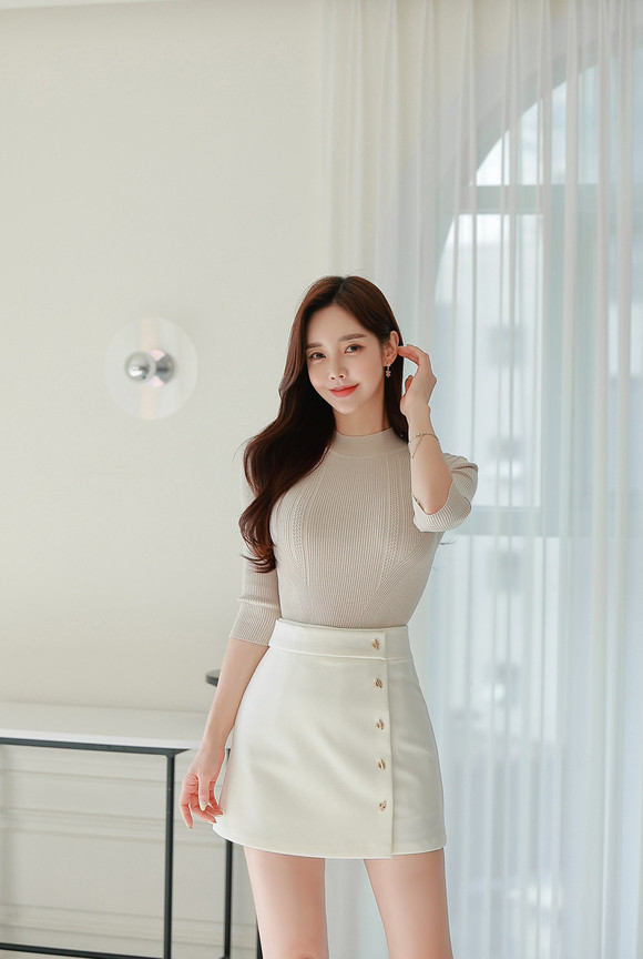 米色高领上衣搭配纯白高腰裙,勾勒出曼妙身姿。裙身的双排扣设计增添复古风情,白色尖头细高跟鞋拉长腿部线条,彰显高挑身材。整体造型简约大方,完美诠释现代女性的优雅与时尚。